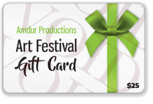 - Gift cards can be picked up at any of our Amdur Productions Art Festivals and Markets (click here for our schedule). Please bring a photo ID to collect your gift card. When you are ready to make a purchase with an artist, fill out the back of the gift card fully and present it to the artist. It’s that easy!